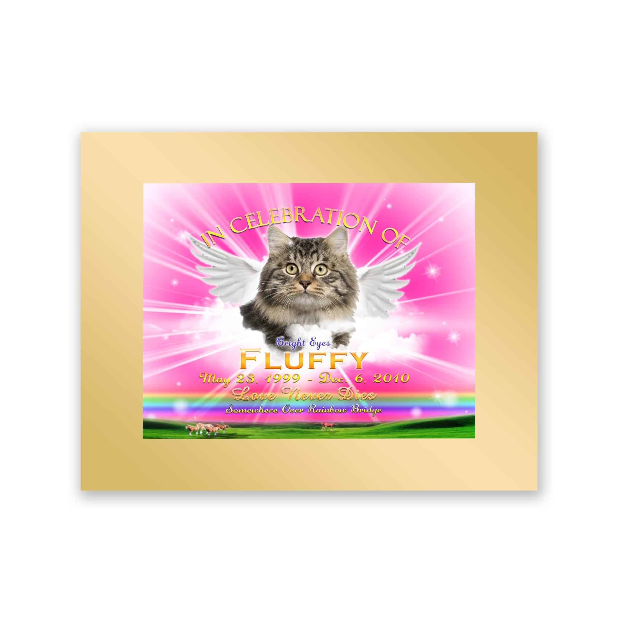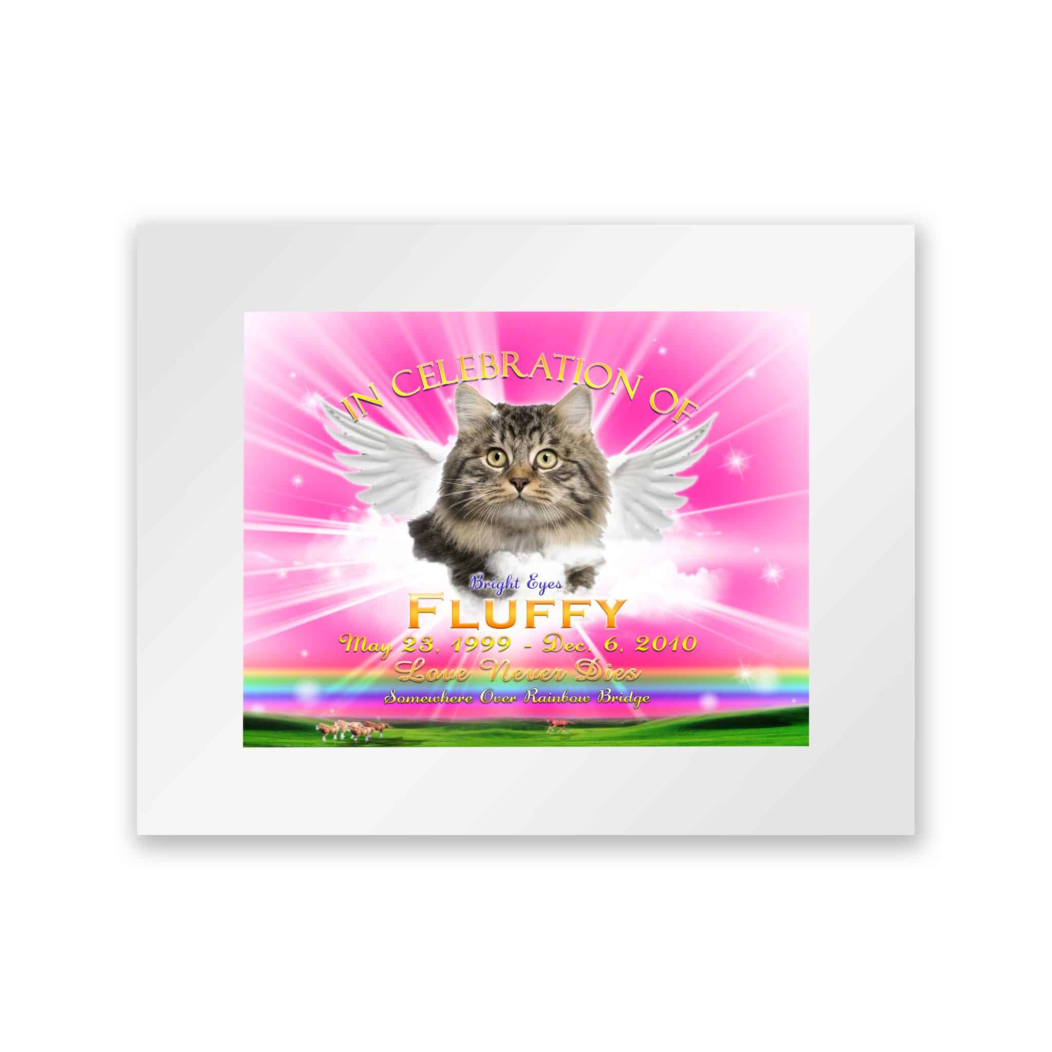 After placing your order, our graphic designer will get working on putting your image in the Rainbow Pink Tribute Picture with Wings. Your Tribute Picture with Wings is packed in a Personalized AnimaLove Box. This beautiful box is our gift to you! A special place to put pictures and/or mementos of your beloved for safe keeping. Tribute Pictures with Wings are backed with 3mm Black Styrene for Easel display. Shipped in 7 to 10 business days.